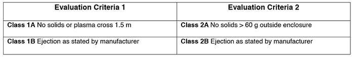 Evaluation Method 2 involves testing the product with an enclosure around the product with different possible mounting arrangements shown in Fig. 2 through 4. For class 2A, no solids with mass greater than 60 g may fall outside the enclosure, while for class 2B, the ejection of solids must meet the ejection as stated by the manufacturer.