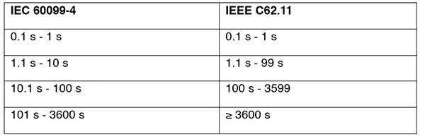 • IEEE allows testing MOV disks for distribution applications with either 8/20 µs lightning impulses or 2 ms rectangular waves, while IEC allows only 8/20 µs lightning impulses. The option for rectangular wave will be eliminated in IEEE for distribution MOV disks.