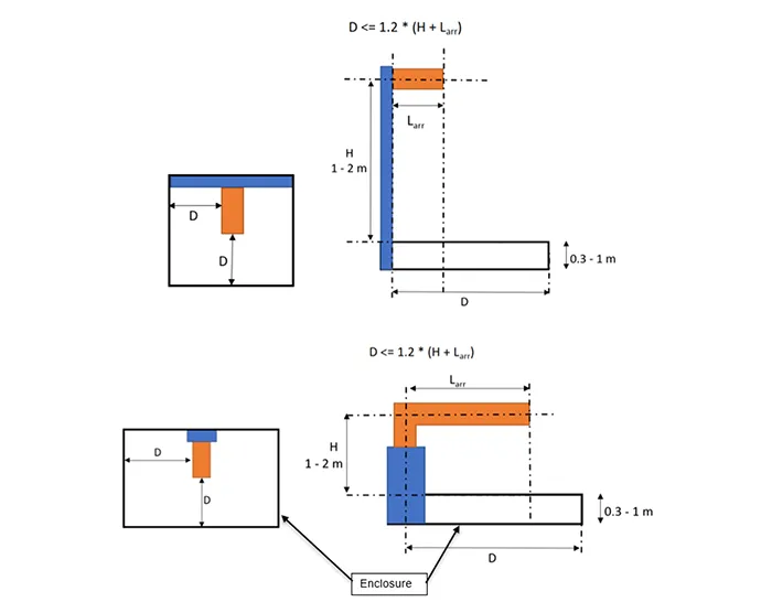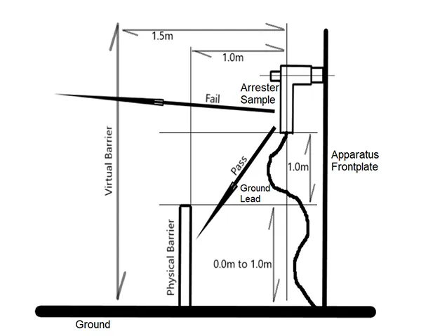 Evaluation Method 1 involves testing the product with a virtual barrier 1.5 m from the arrester with two possible classifications as shown in Fig. 1. For class 1A, no solids or arc plasma may directly cross the virtual barrier, while for class 1B, the ejection of solids or plasma must meet the ejection stated by the manufacturer.