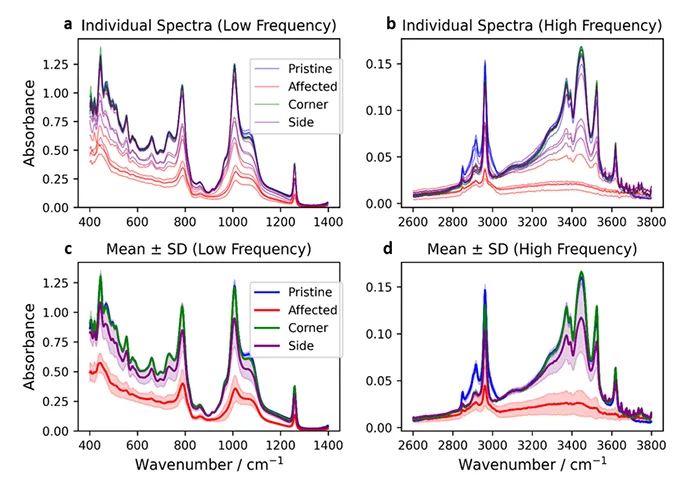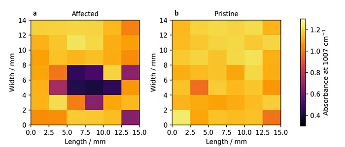 This could also be confirmed with visuals from thermal and visible cameras. When the unaffected regions of μ-IPT™ aged samples were observed under ATR-FTIR, something interesting was observed. The spectra (green) is similar to a pristine sample. The region between affected and unaffected region was also observed and the average was somewhere between affected and unaffected spectra and the standard deviation was wide. This shows the need for selecting the right region to observe. Based on region of choice, outcome could change considerably.