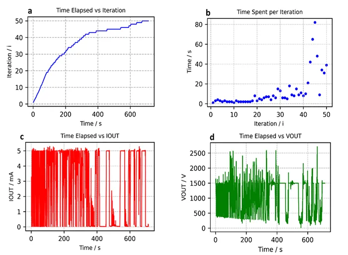 The μ-IPT™ collects electrical data from the DC power supply. A sample was subject to DC electrical stress for a total of 50 iterations. Total time elapsed was compared against total number of iterations, as shown in Fig. 4a. An increase in the time under stress was seen as number of iterations increased. The first 40 iterations were completed in about 300s, but the remaining 10 iterations took close to 400s. Fig. 4b shows how much time was spent on each iteration (ΔT) under an electrical stress. The total test time is close to 700s and the time under electrical stress for each iteration increases. For the first 10 to 20 iterations, ΔT is around the range of 2 to 6s except for the 19th iteration where the time under stress is close to 10seconds. As number of iterations increases, time under electrical stress increases and more randomness is observed. The electrical data of Fig. 4c IOUT and Fig. 4d. VOUT also shows increase in duration of time under electrical stress which could be observed by the increasing blank space. This could be attributed to loss of hydrophobicity which could be confirmed by looking at the visual feeds from the cameras where the water spreading on the surface could be observed.
