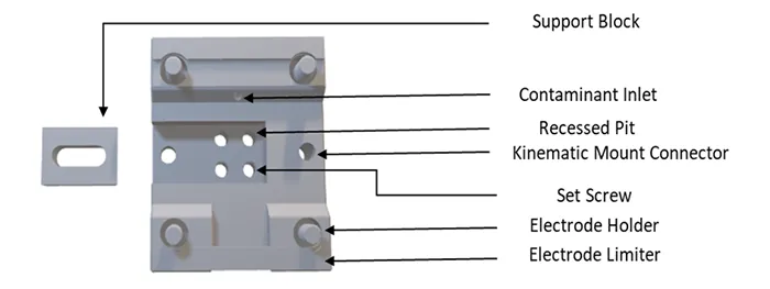 Support Block: A lateral support block slides into the holder and secures the specimen in place as shown in Fig. 2. The block includes a small ledge that grips the sample while coupling to a Thorlabs kinematic mount. The kinematic mount provides fine adjustment capability, allowing precise control of the contaminant flow direction across the specimen surface.