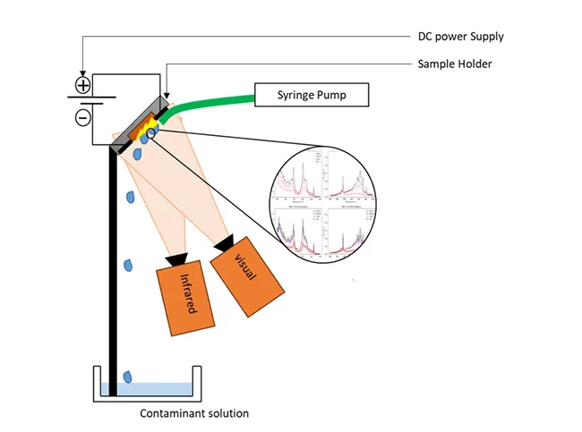 The holder was mounted onto a kinematic mount to enable precise adjustment of the contaminant solution flow direction. The electrodes were inserted into their respective slots and fastened with custom nuts. A contaminant solution was loaded into a syringe and delivered through a tube connected to the sample holder. The positive and negative leads of the DC power supply were connected to the top and bottom electrodes, and the applied voltage was set.