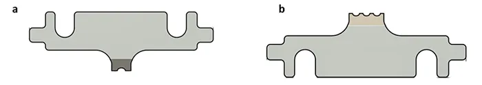 The electrode configuration for the μ-IPT™ was adapted from the standard IEC 60587 inclined plane test (IPT), with modifications to accommodate the reduced sample size. The top electrode (Fig. 3a) incorporates a 1mm diameter opening to allow the contaminant delivery tube to pass through and ensure direct contact of the solution with the specimen surface. The bottom electrode (Fig. 3b) is designed with four protruding teeth to provide multiple contact points, facilitating reliable completion of the conductive path. Both electrodes are equipped with spade connectors for seamless integration with the high-voltage supply. In addition to establishing the electrical circuit, the electrodes mechanically stabilize the specimen, preventing displacement when positioned at the required 45॰ test angle.