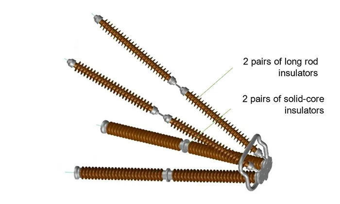 Insulated cross-arms represent a structural alternative to conventional arrangements of steel cross-arms with suspended insulator strings. One of the feasible configurations employs two sets of long rod insulators working in tension and two sets of post insulators operating in compression, as in Fig. 1. This set-up enables optimum utilization of each insulator while also leveraging porcelain’s inherent durability as well as reliable electrical and mechanical performance. This approach allows for a significant reduction in dynamic complexity and physical dimensions of structures, contributing to narrowing a transmission line’s required ROW.