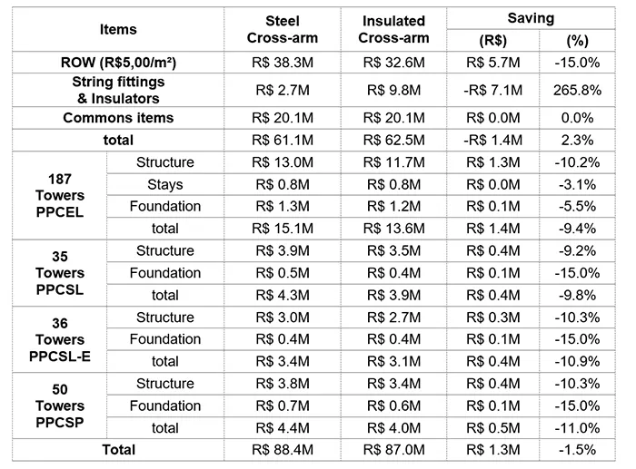 3. Although cost of fittings and insulators increases, overall CAPEX reduction reaches 1.5% (R$1.3M) under the conditions studied, with potential savings up to 6.2% (R$8.4M) in regions with higher land costs.