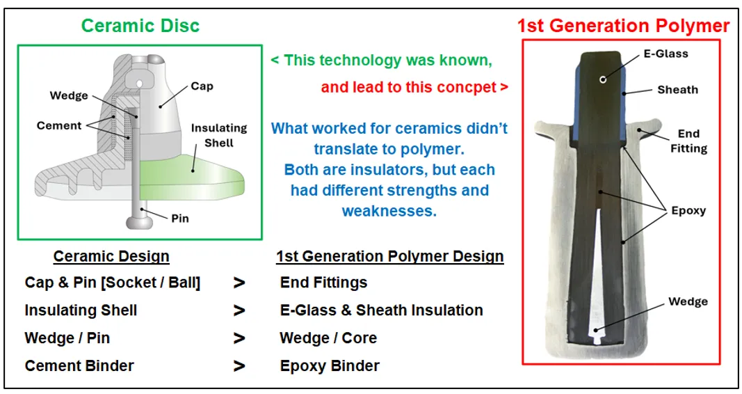 Initial development of polymer insulators was hindered by a limited understanding of polymer behavior in high voltage outdoor environments. Early designs were heavily influenced by ceramic insulator design and standards, which did not translate effectively to polymer insulators. While both materials serve as insulators, they exhibit fundamentally different mechanical, electrical, and aging characteristics. This variance led to less effective performance and a steep industry-wide learning curve for both suppliers and users.