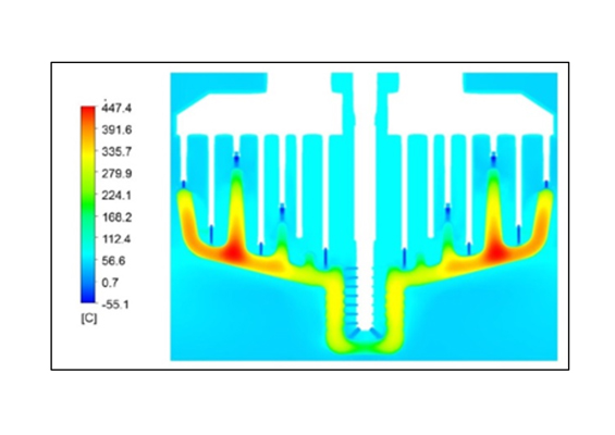 Molding and toughening are important production steps and quality of insulators can be compromised with glass shells containing defects from either of these key operations. Testing can be helpful in screening these aspects and it has become clear that steep front testing makes sense in any sample test plan to verify consistency. Toughening is what makes the glass strong enough to be used on transmission lines. This process therefore requires a careful approach whereby both product shape and tools have to be designed in combination. Fig. 5, for example, shows a typical simulation of the cooling process during toughening and makes clear how product and tools are intimately connected so as to achieve precise thermodynamic requirements.
