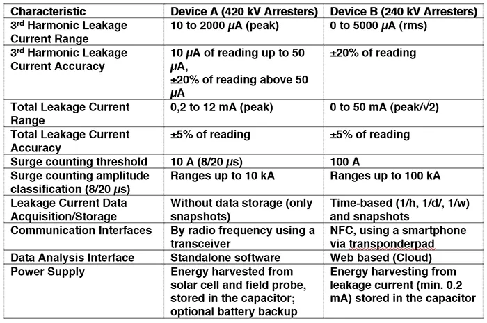 It is important to note that, in the face of technology developments by manufacturers, the technical specifications were slightly different, specifically with regards to means of communication. The two different technologies, hereafter referred to as Device A (used in 420 kV arresters), and Device B (used in 240 kV arresters) are compared in Table 1.