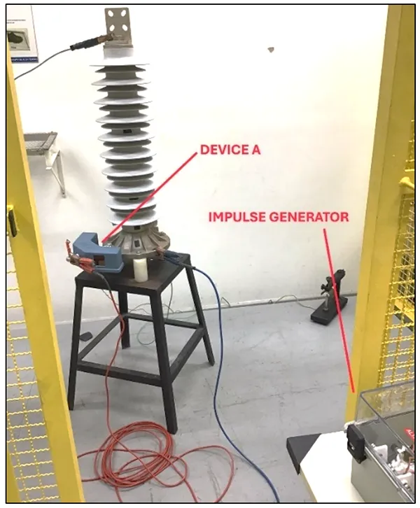 Tests of Device A were performed using the same surge arrester, impulse generator and voltage source as previous tests on Device B. Several impulses were applied, and the device registered all correctly (current range and timestamp). Related to total and resistive leakage current, the following values were obtained, respectively: 800 µA (peak) and 45 µA (peak). Fig. 3 shows Device A under impulse test.