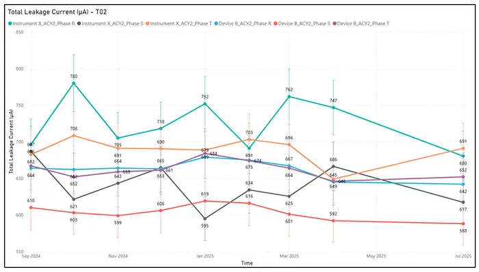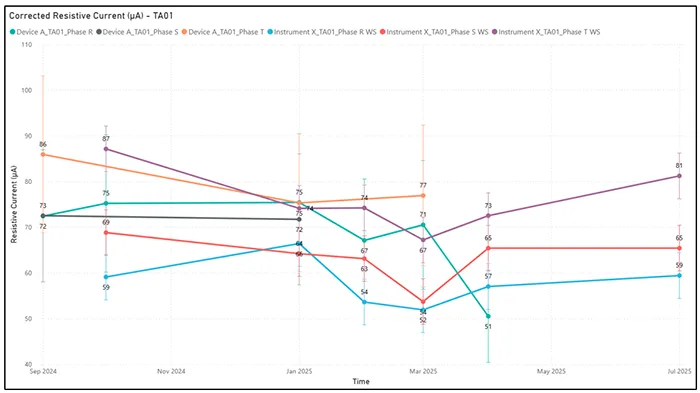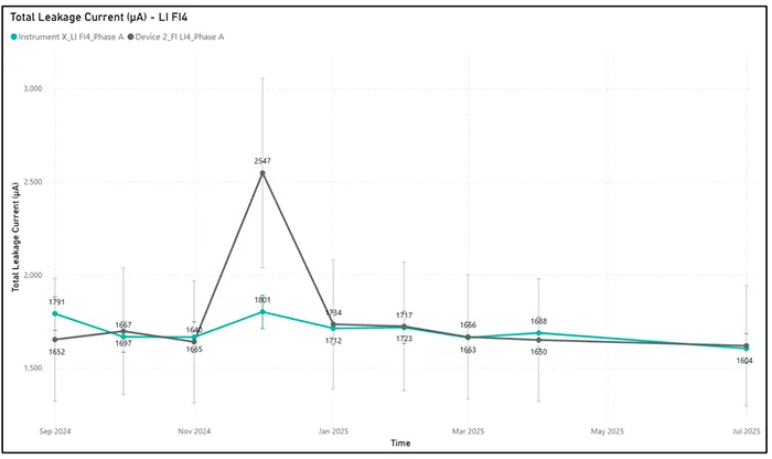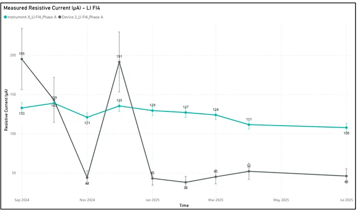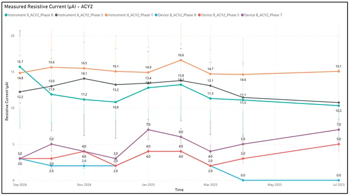 In turn, Device A demonstrated better alignment with Instrument X in measuring resistive leakage current. Although not perfect, the values generally overlapped within the combined error margins of both devices. This indicates that, for this specific parameter, Device A shows reliable behavior.