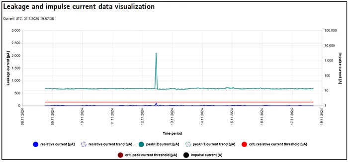 To conclude, screenshots of the software on Device A and the web cloud solution on Device B are shown in Figs. 12 & 13, respectively. In both cases, it is possible to track leakage current trends over time. The major difference is the automatic time-based acquisition on Device B, which allows detailed tracking of the arrester’s behaviour, including detection of sudden changes (as shown in Fig. 13), which was later confirmed to be a switching overvoltage.
