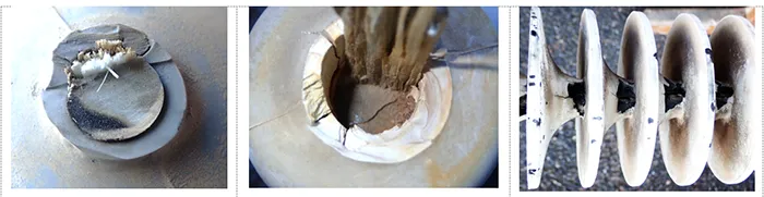 • One design experienced bird pecking through the silicone housing, exposing the core. Based on experience, if core integrity and adhesion between core and housing remain good, such insulators might still operate reliably for 1 to 2 years, especially in low pollution environments.