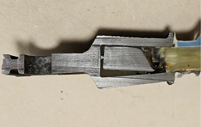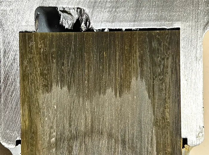 One end fitting of each type of insulator was cut open using a metal band saw. Visible weakness was revealed on only one insulator design, as illustrated in Fig. 15. This was due to an issue with sealing such that the seal did not entirely cover the internal gap between metal flange and rod, leaving an air opening around the insulator.