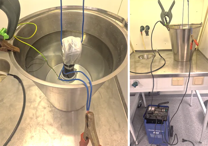 In the first part of this test, galvanic corrosion is intentionally initiated for pre-stressing since corrosion deteriorates impermeability of sealing at the interface between end fitting and housing. The end fitting is put into a metallic container filled with 10l of a mixture of tap water and NaCl, with concentration of 100 g/l. Galvanic corrosion is initiated by applying a DC voltage of about 10V between metal end fitting (positive polarity) and metallic container (negative polarity) for 2h. To concentrate the current at the interface between metal end fitting and sealing/housing, the main part of the end fitting surface is electrically insulated from the surrounding water using plastic foil and insulating tape (see Fig. 18). In this research, the arrangement resulted in a DC current of 10 to 15A.