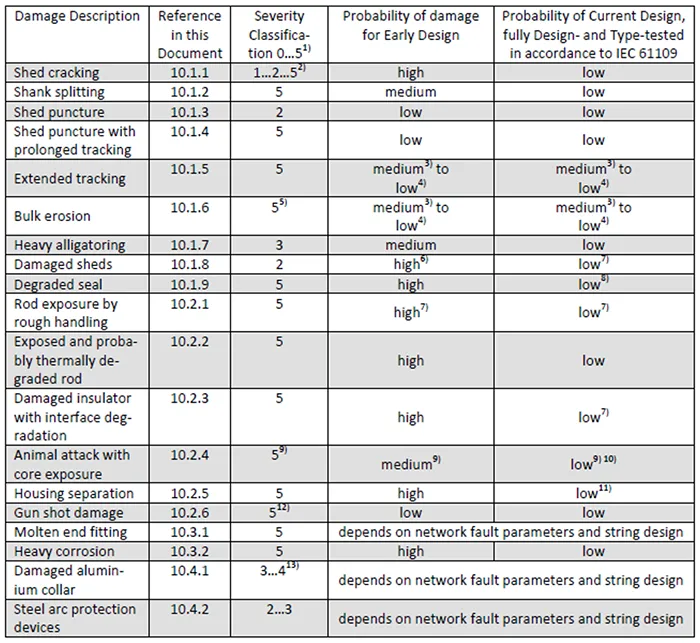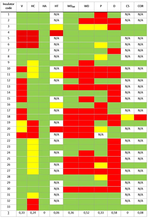 Table 2 offers a summary of the condition assessments for all insulators tested, with the following abbreviations: