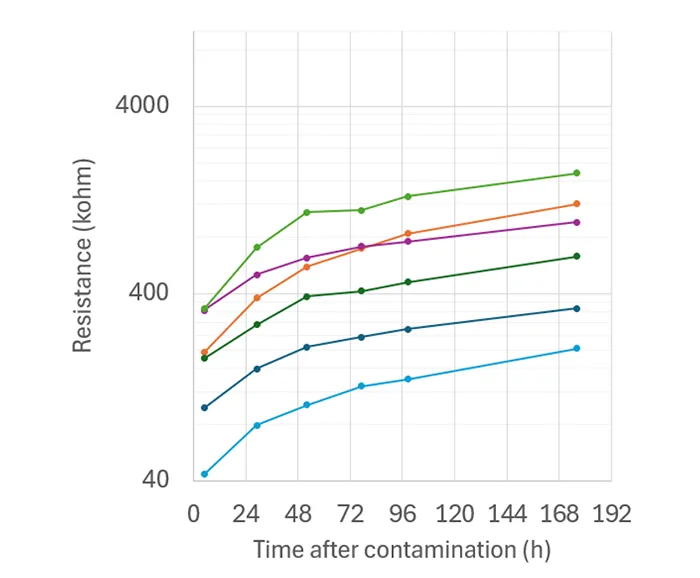 A Hydrophobicity Transfer HT Test (previously known as the Dynamic Hydrophobicity Test) was also conducted. Compared to testing new samples, the only modification saw gentle cleaning of service-aged samples prior to testing to remove natural pollution. The principle behind the HT test is that Low Molecular Weight (LMW) components—which are key to the hydrophobic properties of a material—migrate into the pollution layer and encapsulate any surface salts. This migration leads to a gradual increase in the electrical resistance of the pollution layer, even if hydrophobicity has not yet fully recovered at the surface. Such behaviour is often observed for insulators operating in contaminated environments and has been corroborated through both visual inspections and electrical measurements. Monitoring the resistance increase of the polluted layer over time allows an insulator’s hydrophobicity transfer ability to be assessed. Fig. 11 illustrates the typical increase of surface resistance for a single test series.