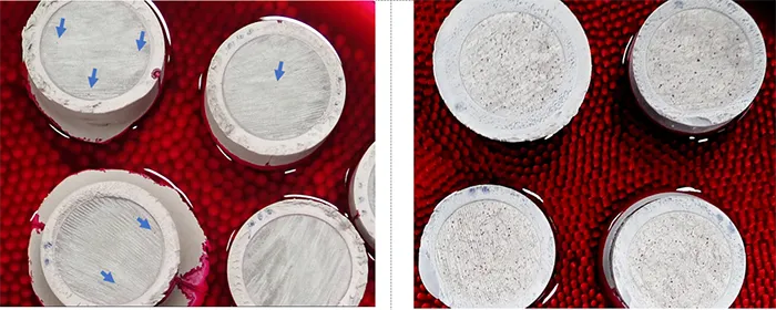 • Visual evaluation of cross-sections of fittings/sealings (CS). If no remarks were found, results are marked as GREEN. In this case, air gaps, not filled by the sealing were found on one design, which was marked YELLOW.