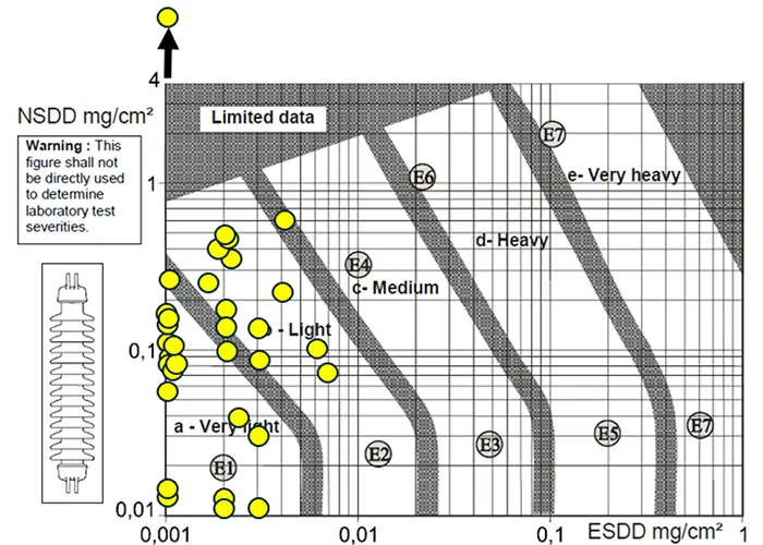 Results are plotted in Fig. 8. Adopted from IEC/TS 60815-1, this type of chart is formally for porcelain long rod insulators and can thus be used only as an indication for composite insulators. These did not differ much in terms of design, manufacturer or time in service. Basically, all measurements indicated that these insulators were in “Very Light” to “Light” Site Pollution Severity (SPS) classes (“Light” to “Medium” using conservative approach plus one SPS).