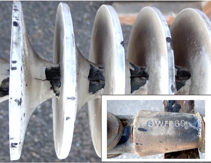 These insulators were removed based on indications from service performance, and as such, likely over-represent insulators of poor quality. Several were delivered in pieces due to brittle fracture or flashunder during service, as in Fig. 4.