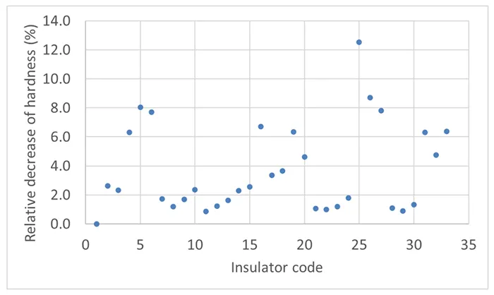 A hardness test was performed on samples according to IEC 62217 before and after 48h immersion in boiling water, i.e. slightly longer than the 42h specified in the standard. Average hardness after boiling must not differ by more than ± 20% from the average for non-boiled samples. For each insulator, 10 measurements were performed, either on top and bottom or middle and bottom, thus covering all different positions along the sample.