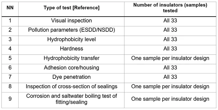 If no tests were performed for any specific type of insulator, this was marked by N/A.