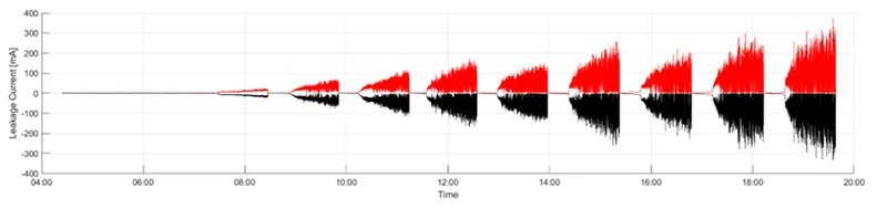 Fig. 15 illustrates an example of the influence of humidity. Increased humidity in the morning and at sunset causes a noticeable spike in leakage current. Leakage current in the case under examination is low because the pollution level is less than that used for design of the post insulator being monitored.