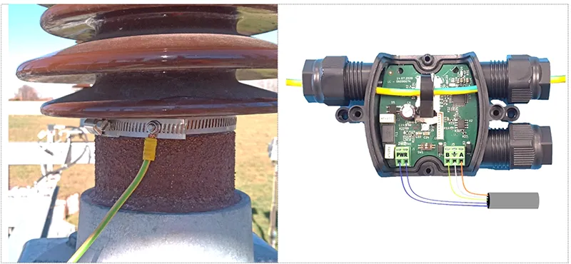 Leakage currents that flow along the surface of insulators are collected in the field by a sensor through an adaptive metallic collar, shown in Fig. 12, that is monitored within a time-configurable window. The current peak (Ih) is recorded with high-speed sampling, saving only the highest value and frequency repetition and its timestamp within each time window to minimize data traffic. RMS values are also acquired to provide an overview over time.
