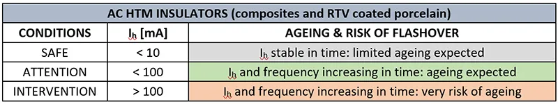 Table 2 gives preliminary indications for AC HTM insulators, taking into account possible impact of leakage current on insulator ageing. For HTM insulators reference is to be made to the Ih peak with high frequency. Considering that the presence of random peaks up to 250 A can be neglected both from the ageing and flashover point of view.
