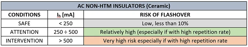 Data indicate that risk of flashover for ceramic insulators is low, with Ih lower than 250 mA but then increases reaching a value of 100% for leakage currents approaching 1A. Moreover, that diagnostic criterion should also consider repetition frequency of Ih: close to complete flashover, frequency of current peaks increases.