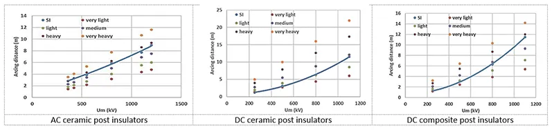 Design of post insulators for Air-Insulated Substations (AIS) is primarily guided by their performance requirements under continuous voltage, particularly in the presence of pollution, as well as their resilience to switching overvoltages. A preliminary assessment of required insulator sizing was conducted (see Fig. 5). As indicated, although switching overvoltages (simulated in laboratory conditions by switching impulses SI) determine design decisions in relatively clean environments, insulator performance under pollution becomes the critical factor at elevated pollution levels, especially for DC applications.