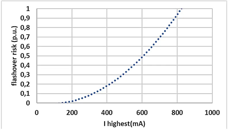 Based on detailed analysis of available experimental results, risk of flashover as a function of leakage current was defined in AC for ceramic insulators (see Fig. 7).