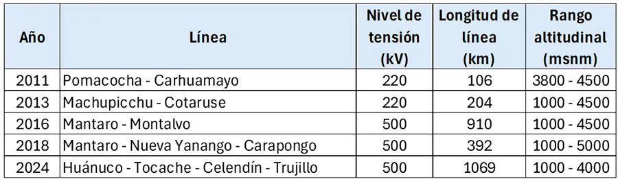La experiencia a nivel mundial en líneas de extra alta tensión en niveles altitudinales superiores a 3000 msnm es poca. En Latinoamérica, ISA es pionero en este tipo de líneas de transmisión y su recorrido a lo largo de más de 14 años en el diseño y ejecución de proyectos, principalmente en Perú, que por su ubicación geográfica van desde los 1000 hasta los 5000 msnm, ha permitido capitalizar conocimiento y experiencia valiosa para el sector eléctrico.