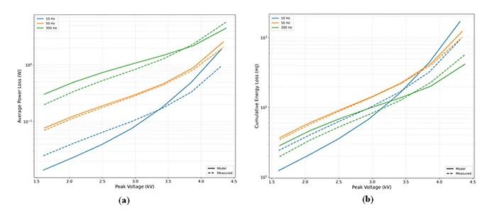 Validation of energy dissipation was performed across 42 test cases spanning 7 frequencies and 6 voltage levels. Fig. 11 presents the power losses and the cumulative energy compared between measured MOV and calculated FD model values for 3 test cases.