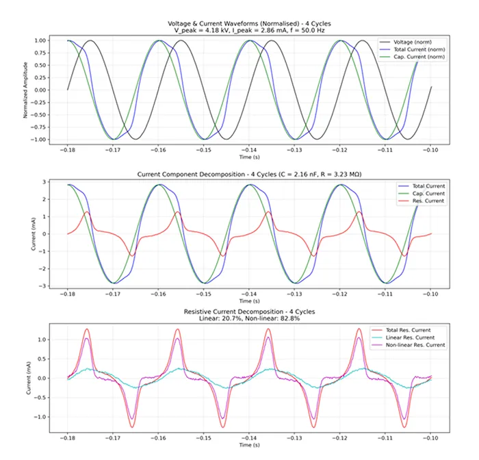 Measurements were conducted at frequencies of 10, 17, 27, 50, 100, 150, and 300 Hz, capturing the power frequency, harmonics up to the 6th order and sub-harmonic frequencies to cover the entire region of frequencies relevant for TOVs. Voltage levels ranged from 1.3 to 4.7 kV peak for the first block and 3.0 to 10.0 kV peak for the second block were selected to characterize the leakage current region while maintaining measurable current levels above the noise floor of the setup. Decomposition of the measured arrester current, as seen in Fig. 4, separates the total current into its capacitive and resistive components. The decomposition methodology provides insight into the distinct conduction mechanisms within the MOV structure.
