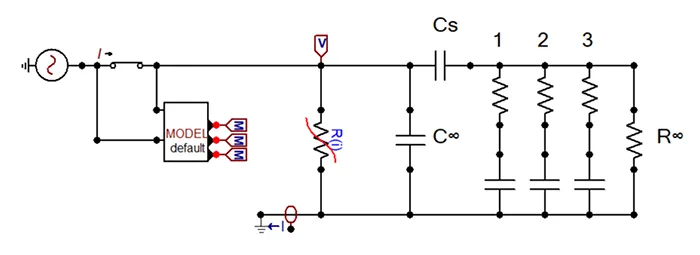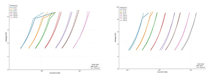 Direct comparison of measured and modeled V-I characteristics confirms the model’s ability to represent the transition from linear to nonlinear conduction. Fig. 12 shows this comparison across the frequency range tested. The model captures both magnitude and slope of the V-I curves, indicating good representation of the voltage-dependent conduction mechanisms. Minor deviations at intermediate frequencies reflect the approximation inherent in representing a continuous relaxation spectrum with discrete RC branches.