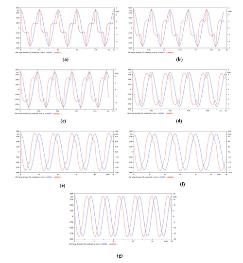 The measured voltage-current characteristics in Fig. 7 reveal that below the knee voltage point of the MOV, the current is capacitive dominant while above the knee voltage, the nonlinear resistive behaviour takes over. The transition from capacitive to resistive behavior occurs between 4-4.5 kV peak for the first block and between 9–10 kV peak for the second block, corresponding to the onset of arrester conduction.