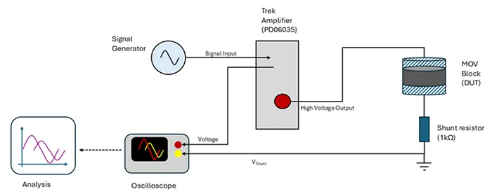 A high-voltage test circuit was developed to characterize surge arrester blocks across multiple frequencies (see Fig. 2). The test set-up employs a precision high-voltage amplifier capable of delivering up to 30 kV at 20 mA over a frequency range extending to 300 Hz. The amplifier drives the MOV block under test through a mechanical test fixture designed to apply 1 kN of compressive force, ensuring consistent electrical contact between the block and the test electrodes. Current measurements are obtained using a 1 kΩ shunt resistor connected between the arrester’s bottom electrode and ground. This configuration avoids phase distortions introduced by the amplifier’s internal current monitoring. Voltage and current signals are acquired using a PicoScope 6424E oscilloscope and the sampling rates are adjusted based on test frequency.
