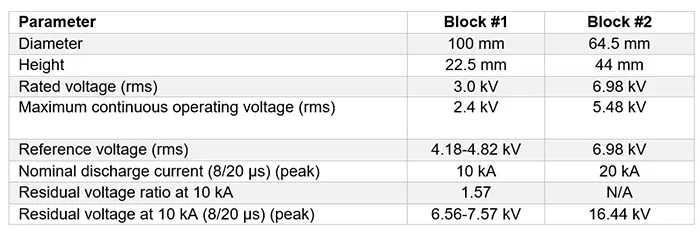 Validation was performed on two different station-class surge arrester blocks (see Fig. 3). Table 1 presents their manufacturer specifications.