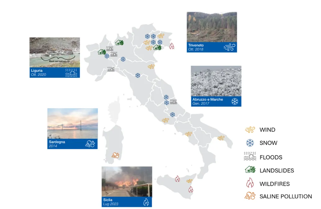 Power infrastructure is particularly at risk from such events since it is extensive, exposed, and interdependent. Overhead transmission lines traverse forests, mountains, and coastlines, making them frontline victims of environmental extremes. Moreover, the situation experienced in 2024 is not new. Indeed, several weather-related events have struck the Italian transmission network in recent years: heavy wet snowfalls have caused line trip outs, short circuits and structural failures; strong winds have torn apart towers and uprooted trees; heavy rain, floods and landslides have led to submerged station equipment, collapsed line foundations; and extensive wildfires have impacted significant portions of the territory, causing physical damage, supply interruptions and danger for property, local residents and firefighters.