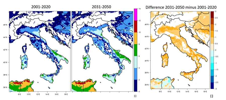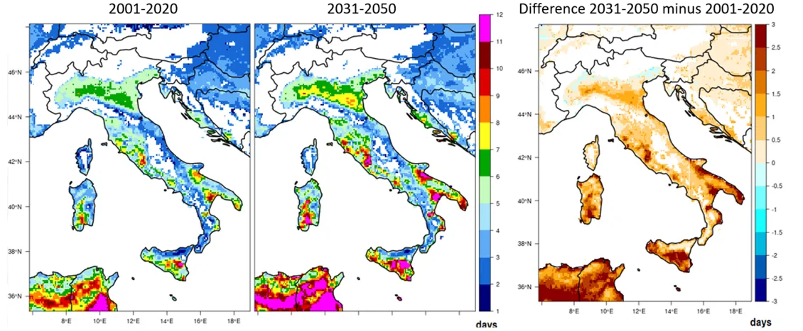 As regards the average duration of heat waves (Fig. 13), a significant increase of more than 1 day is expected on different areas of the Po Valley, while on several areas of central Italy and especially in southern Italy and islands, an increase of more than 2 days or even locally greater is expected.