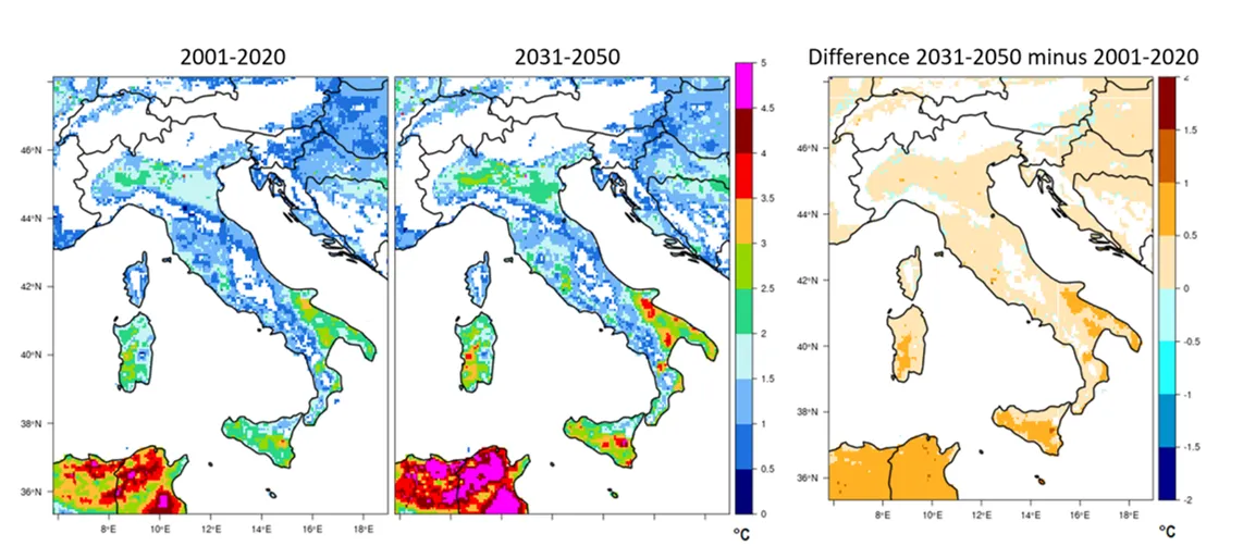Finally, as far as average intensity of heat waves is concerned, the signal is more uniform than other indicators. A general increase of up 0.5°C is expected for the Po Valley and central Italy, while in the south (in areas such as Puglia, Sicily and Sardinia) a higher increase, i.e. between 0.5 and 1°C can be observed.