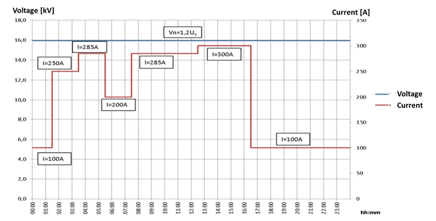 Electrical and thermal stress was applied according to the cycles shown in Fig. 3, alternating, under applied voltage (U0 for the first 150 cycles and 1.2 U0 – 15.9kV for the remaining cycles), a heating phase, and a cooling phase of the conductor, while maintaining a minimum current circulation threshold of 100A.