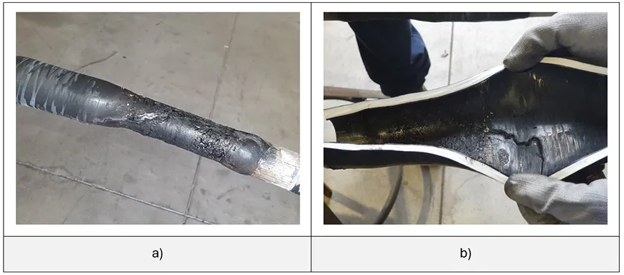 Similar phenomena occurred as well to the 2 new cable joints (9 & 10) of the same type of C2. Fig. 10, for example, reports measurements on Cable 10. In this configuration, ingress of water was apparently not linked to ageing from high temperatures (in the new set-up temperature never exceeded 50°C), but probably to a poor assembly of the joints, after the initial settling period. This problem eventually led to discharges in both new joints (9 & 10) after about 240 and 250 cycles respectively (see Fig. 11). The fault seems to have ‘wrapped’ on the cable starting from the conductor up to the screen (left); signs of discharge could also be seen along the main insulating body (right).
