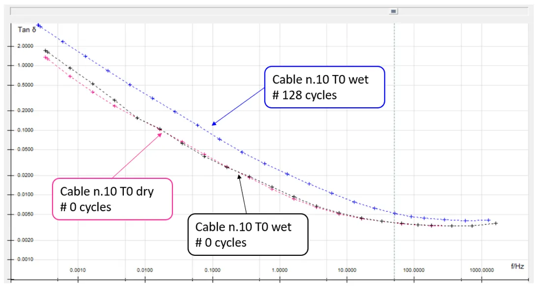 A total of 828 temperature cycles was applied (scoring nearly 20,000 hours of test), over more than 3 years (not continuous). Periodically, the test ring was disconnected, and the global conditions of each single cable were tested by means of partial discharge (PD) measurements, Frequency Dielectric Spectroscopy (FDS) tests and Dissipation factor (Tanδ) measurement, using commercial instruments.