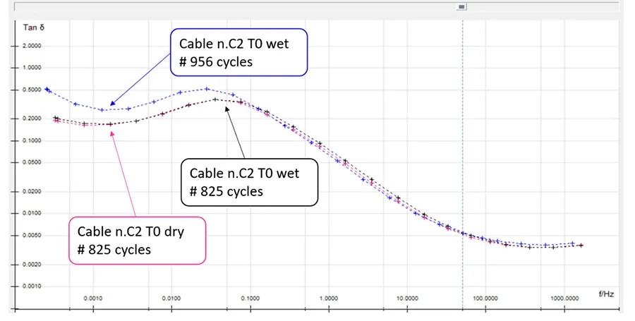 • The sole dielectric loss test at power frequency of VLF does not appear sufficient to characterize ageing, especially when extruded cables are part of the sample, since material polarization can occur from one set of testing cycles to the next. FDS measurements in the range from 0.001Hz to 5kHz allow better discriminating this phenomenon, thus avoiding biased test results and false alarms.