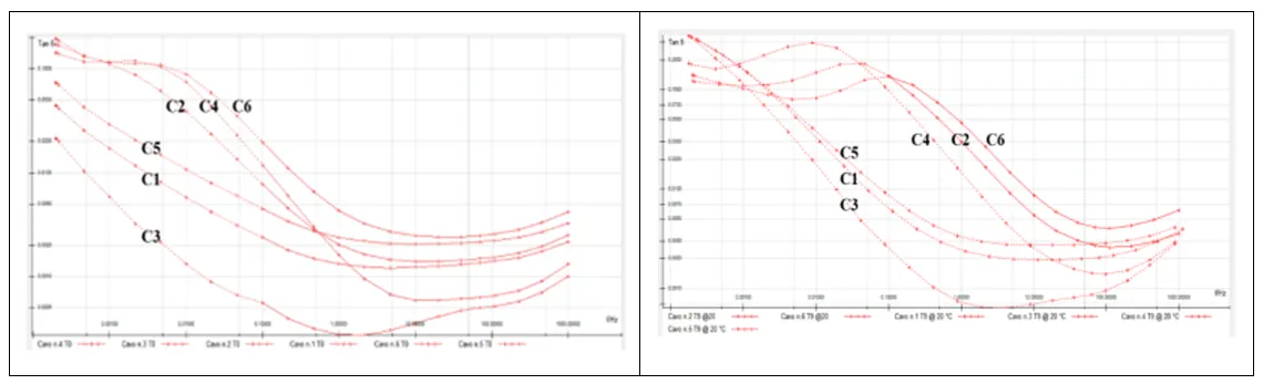 From Fig. 9 referred to Sample C2, the initial measurements (at T0) in dry and wet conditions are perfectly superimposable, but after 120 cycles (T1) the loss curve shifts upwards. This deviation is probably a consequence of the fact that barriers to water penetration have degraded because of the thermal and mechanical stresses introduced over the previous ageing period.