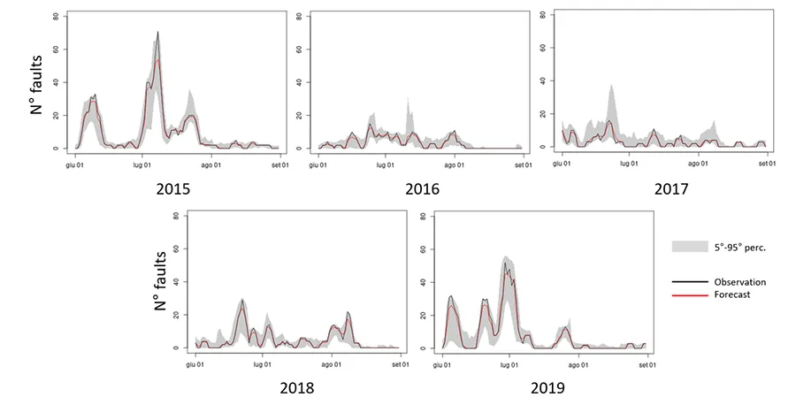 Fig. 2 reports on results of applying the model and demonstrate good correlation with observed daily fault rate for all summers. The model is also able to satisfactorily reproduce the highest peak (reached in July 2015 and 2019 when powerful heat waves affected the northern part of Italy). An indication of the uncertainty associated with the prediction is shown by the grey bands around the line of predicted faults representing 5th and 95th percentile of distribution of fault values coming from Random Forest decision trees.