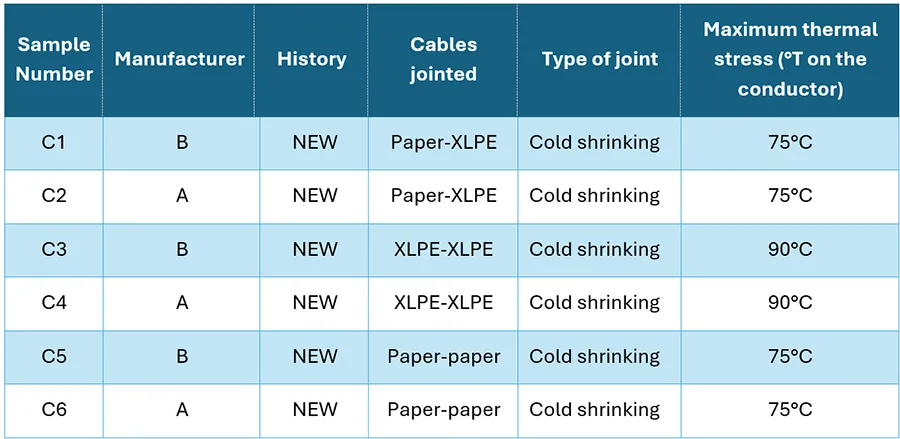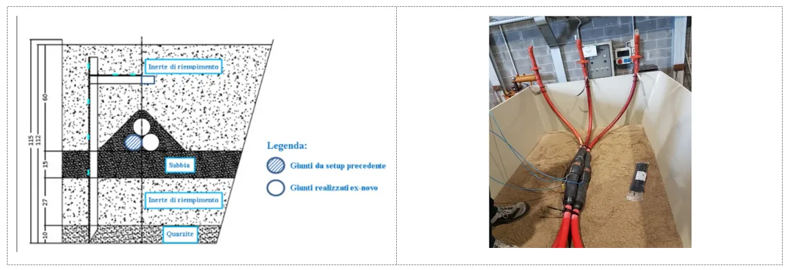 Test samples were of different types, i.e. new or aged in the laboratory or in service. Different set ups in terms of cable burying conditions were simulated, as described. Each test set-up was also replicated (with the same typology of joint) by mirror rings under similar conditions but without voltage. That allowed measuring the temperature inside joints and on the surface of the conductor, using thermocouples installed in the internal layers of the joints.