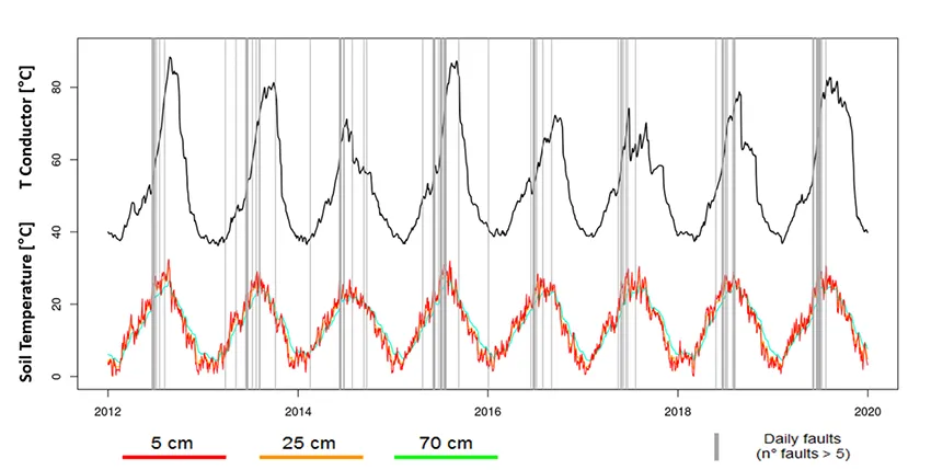This behavior is related to dependence of some terms of the equation on the soil thermal conductivity which in turn depends on moisture. It can also be seen that periods with the highest fault frequency do not coincide with the periods with highest conductor temperature but often with periods where conductor temperature has the steepest increase at the beginning of the summer, exceeding the threshold of about 50°C. Looking at Fig. 1, it is also clear that the most important factor determining faults seems to be the steepness of the conductor’s temperature curve. This is clearly noticeable considering the summers of 2012 and especially 2015.